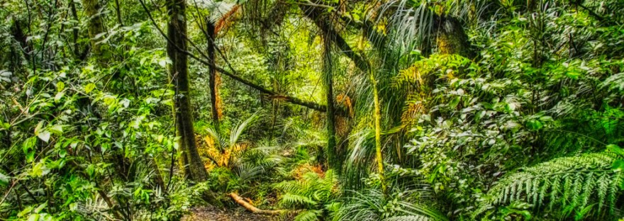 As I had questioned my fitness for most of the previous day and the day of the hike, I was somewhat relieved when the track started off at an easy gradient. Being surrounded by tall punga trees made for a lovely view, as there was no need to keep my eyes focused on the ground at this stage. Then, before long, we crossed a small bridge before the track crossed and trans alongside and above the Waitekohe Stream. The track then heads gradually upwards. At one point, through the trees, we can see waterfalls below with a pool and pass an unmarked trail leading down towards them.