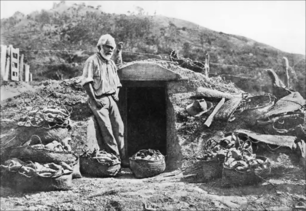 Photo: NZ Archives – East Coast New Zealand Maori man standing at the entrance of a traditional underground food store (pit) for kumara (sweet potatoes) and potatoes.