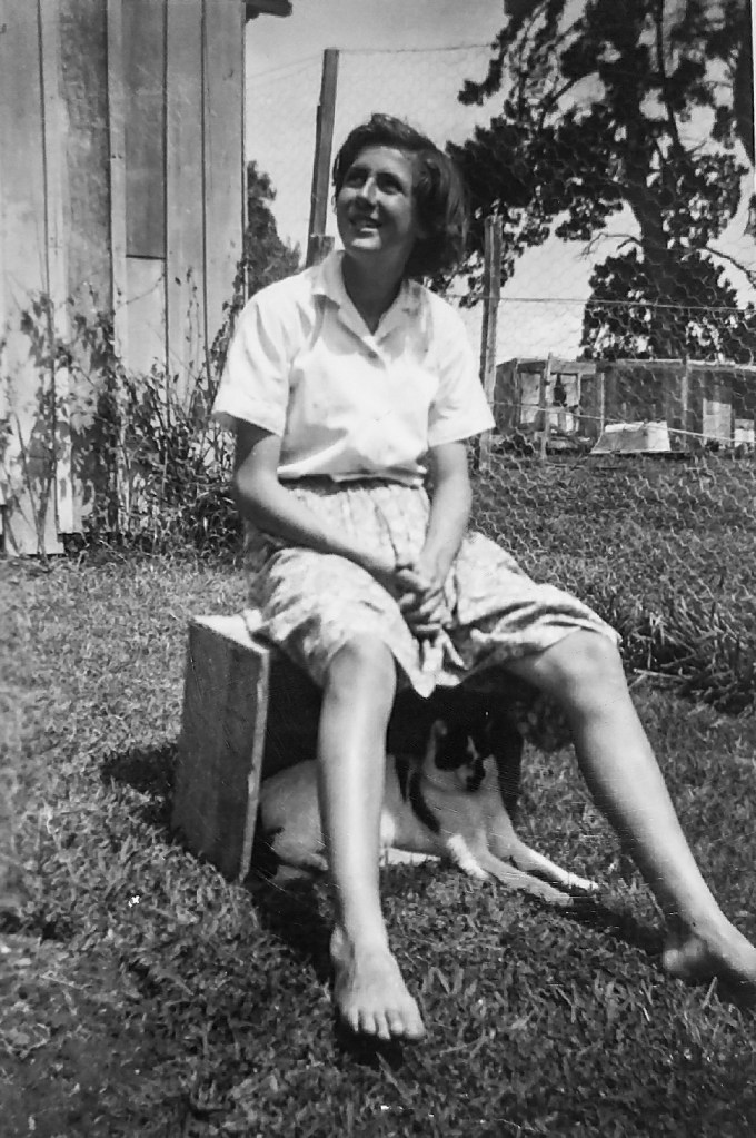 Mum sitting on one of those wooden kumara boxes with the family cat