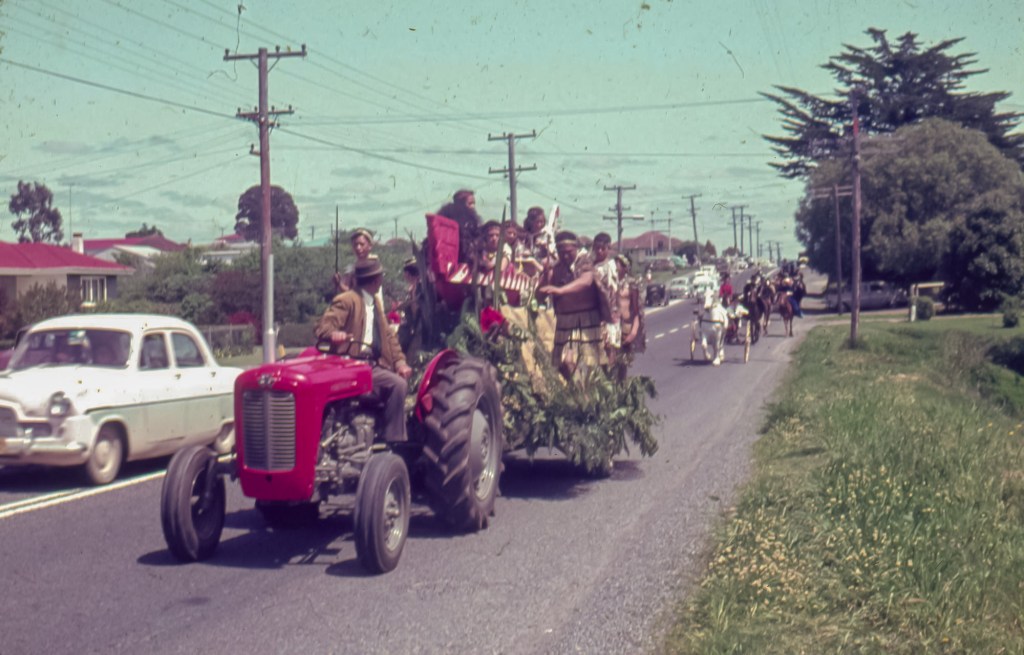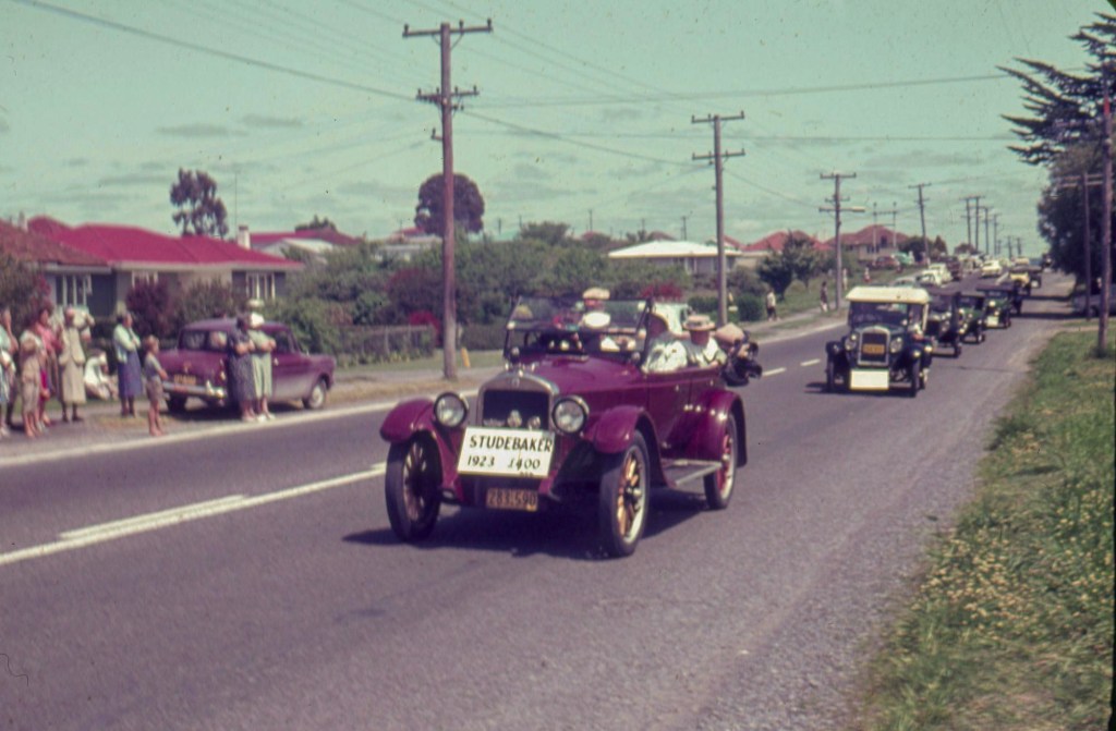“A unique transport parade through the last fifty years was staged to coincide with the historical exhibition at Tauranga Town Hall. The cars proceeded along Cameron Road from the racecourse and parked for an hour in Wharf Street, where spectators could inspect the many interesting and valuable vehicles.” Tauranga Photo News, 7 December 1963.