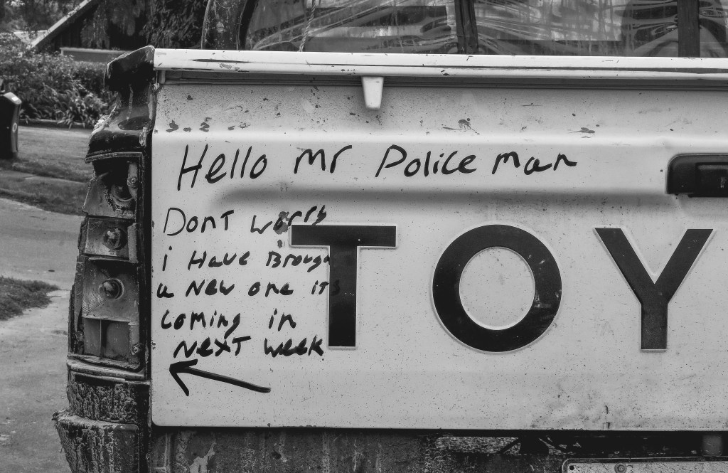 A sign on the back of an old Toyota truck reads, “Hello Mr Policeman, Don’t worry. I have brought a new one; its coming in next week.” Classic.