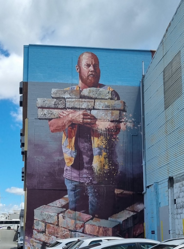 He describes the above mural as a guy building a wall around himself and blocking himself away. It’s a reaction to growing Trumpism in Australia and New Zealand, the whole ‘build a wall’ and ‘stop the boats’ mentality.
