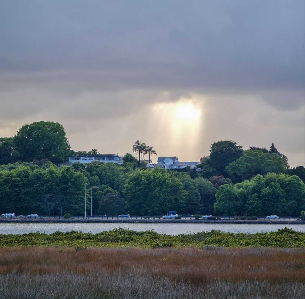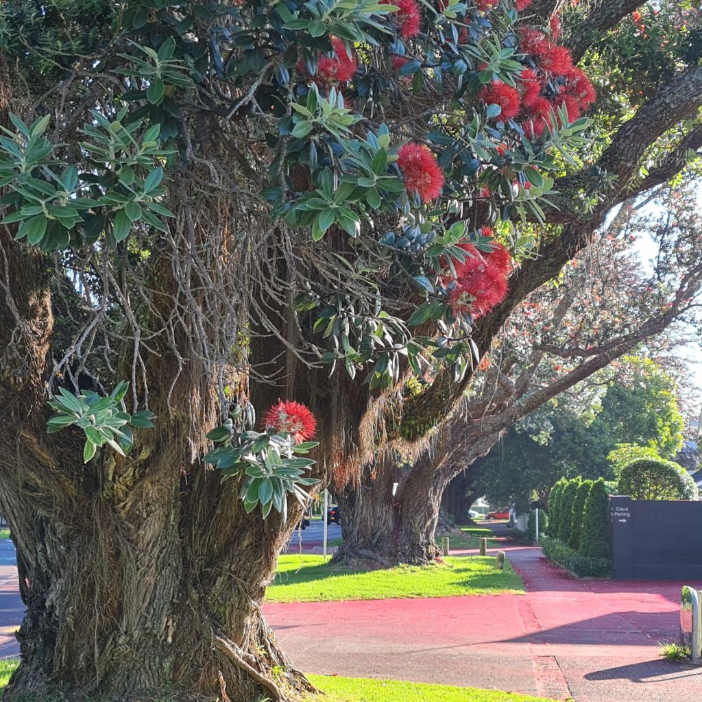 Meanwhile, as I walked along the footpath, I admired the magnificent Pohutukawa trees, standing firm, their leaf-laden branches unmoving. No wind. Blissful.
